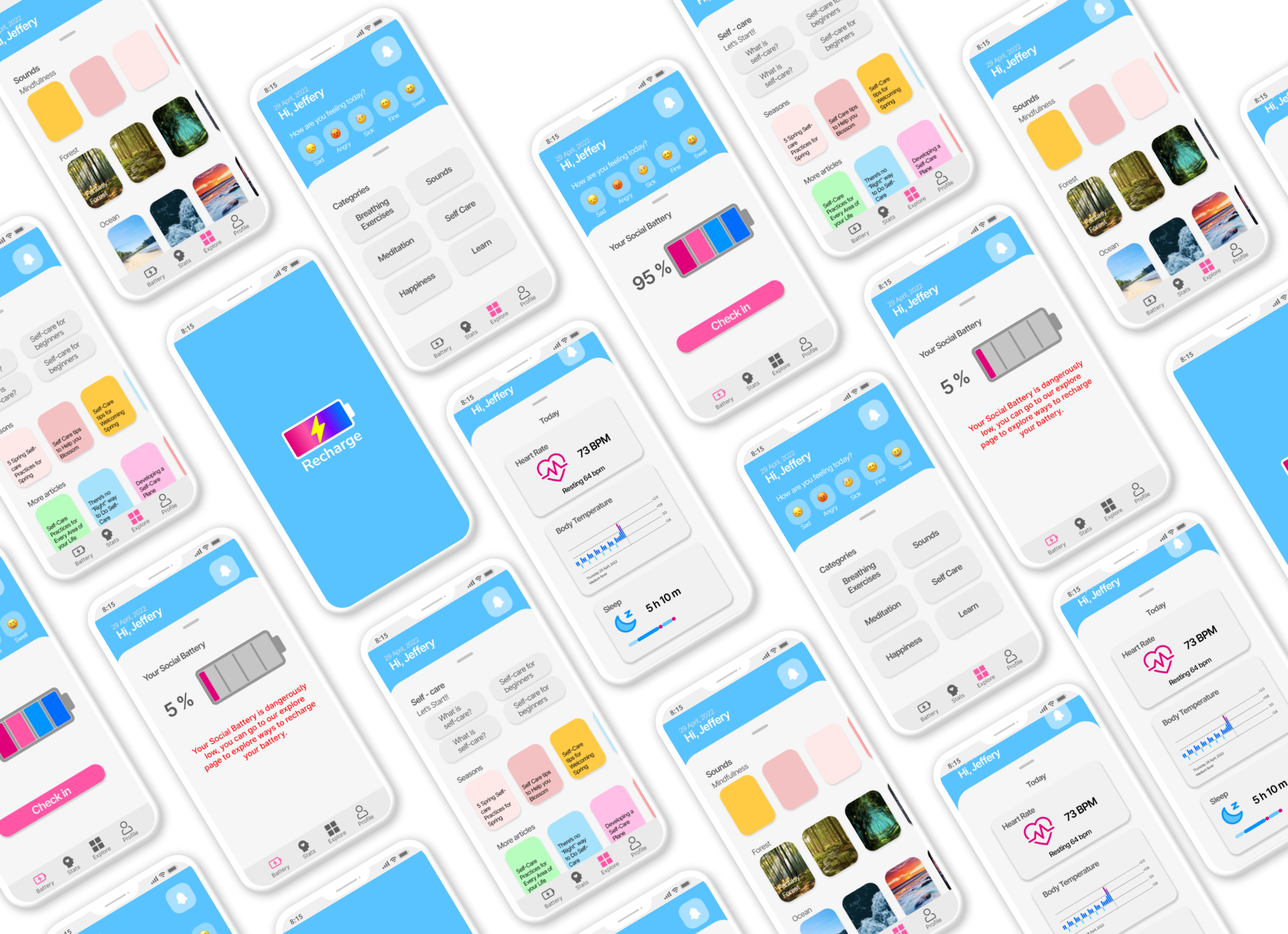 With Recharge’s APP, you’ll be able to track and record your heart rate, body temperature, and sleep times to track your health. You’ll also be able to explore more about Self-care and how Self-care is essential for you and your social battery.